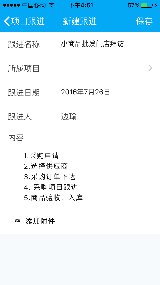 通过“外勤”管理销售人员门店拜访及数据采集信息,不需要电话追踪, 管理者可随时通过手机端查看每一位外勤人员工的工作状况,在线完成拜访记录、补货订单等工作,让信息传递更迅捷。